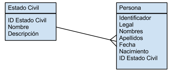 Ahora para mejorar un poco el modelo y controlar mejor los distintos estados civiles a los cuales una persona puede pertenecer, se puede dejar el estado civil aparte y referenciar como una llave foránea a ese tipo de estado civil, eso mejora la calidad de los datos y lo restringe a una cantidad limitada de opciones, el modelo quedaría así.