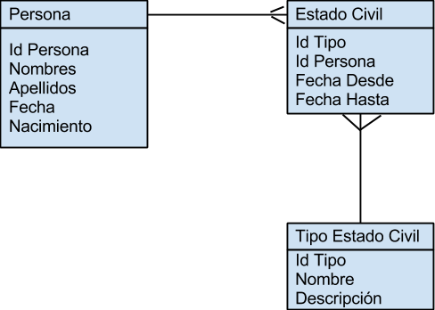 Hasta ahí yo quedaría conforme y me daría una gran felicitación por la normalización y sería muy feliz, pero resulta que yo no había visto que en realidad esto debería ser sólo una parte, para el negocio de guardar información de personas no sólo es importante guardar la foto de la persona como un estado estático, si no que hay que verlo como una máquina de estados, el estado civil se comporta como eso, en un momento del tiempo estoy soltero despues casado y yo espero quedarme muuuuuuucho rato en ese estado, pero otra persona puede cambiar a separado a soltero de nuevo, viudo, y si se trata así solamente se perderían los cambios en el tiempo que es información muy útil para algunos negocios, sobre todo para los que tienen en mente explotar la información en algún momento del tiempo, ya que los solteros se comportan de una manera, los casados de otra, y lo que estuvieron casados y ahora son solteros de otra, por lo que es crucial poder registrar esta información y modelarla como tal. Una aproximación a este modelo sería.